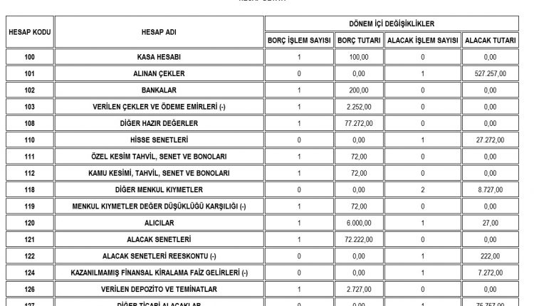 Yevmiye ve Büyük Defter berat dosyalarında vergi detayı bilgisi listelenirken Defter Raporu Beratı’nda vergi detayının yerini hesap detayı almıştır. Bu alanda defter-i kebir dosyasına yansıyan hesapların “Hesap Kodu”, “Hesap Adı”, “Borç İşlem Sayısı”, “Borç Tutarı”, “Alacak İşlem Sayısı” , “Alacak Tutarı” bilgileri yer alacaktır.
